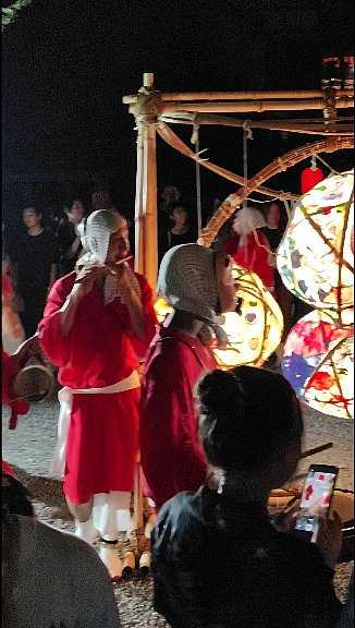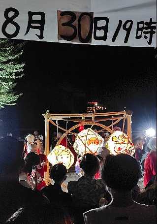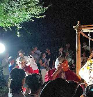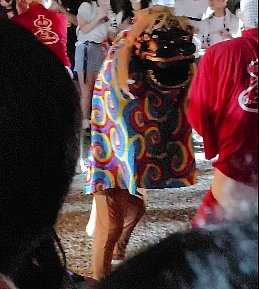 盆踊りと聞いて連想するような近所の人たちがやぐらの周りで踊る、という感じではなく、ひょっとこや狐、おかめなどのお面をかぶった法被姿の人たちや獅子舞が笛太鼓にあわせて踊りまわるという、ちょっと 妖しげな雰囲気 を醸し出していました。このあたりの伝統芸能なのかな。