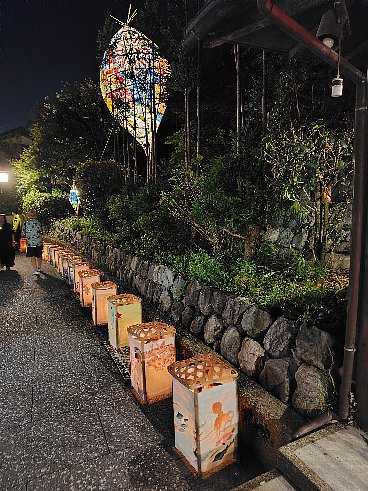 嵯峨野保勝会という地元団体と、嵯峨野に自分の庵を持つ瀬戸内寂聴さんが立ち上げた行事で、行灯の数は大小800基、奥嵯峨の古き良き街並みを行灯のほのかな灯りで演出しています。