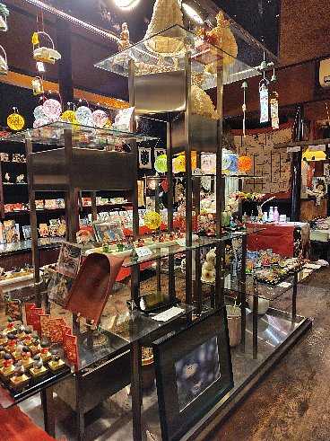 石垣の上の方に、 「まゆ村」 というまゆ細工のお店があり、カミさんが見たいというので息を切らせて石段を昇りました。