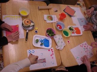 日差しも明るくなり、春が近づいています。オオイヌノフグリやほとけのざの花が咲きはじめました。今日は、春になったら(今からでも)使える、万華鏡づくりをしました。中身の入れ替えができるので、お子さんとのお散歩の途中で見つけたすてきなものを入れて楽しんでいただけるといいと思います。写真は、野菜スタンプで、万華鏡の外側を装飾しているところです。
