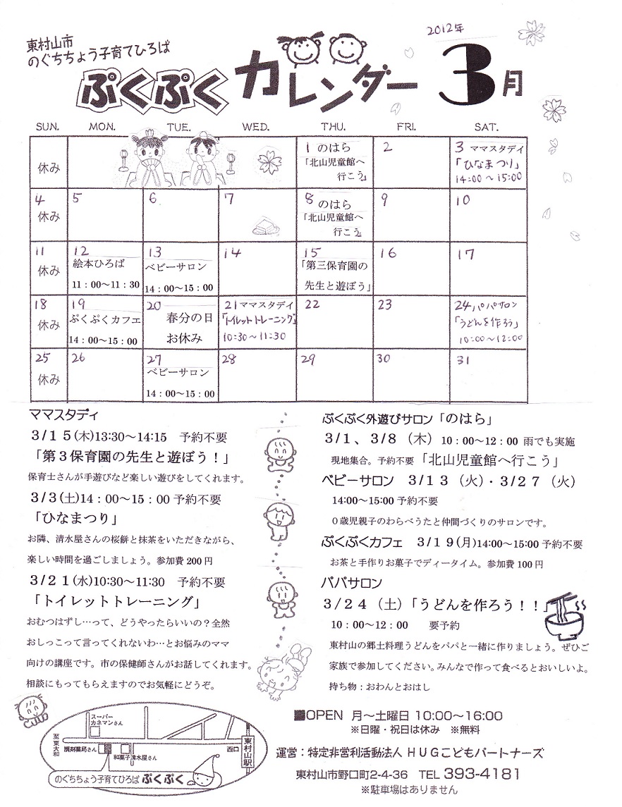 3月の予定をアップしました。3月3日はひな祭りです。ぷくぷくでは、桜餅と抹茶をいただきます。お散歩がてら遊びに来てね。