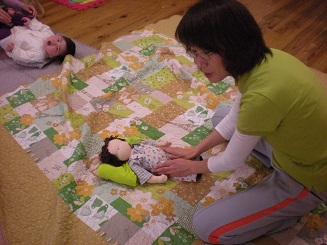 今年度最後の「親子体操」でした。あいにくの雨で4組の参加でしたが、パパの参加かが2組あり、赤ちゃんとパパの触れ合いがいっぱいあるパパサロンになりました。いつもやっている、赤ちゃんの体の力を抜いてまっすぐにしてあげる、ずんずん体操などの合間に、「離乳食を食べないんです」という質問がありました。先生は「はいはいは、しますか?」ときいていらっしゃいました。「ひざつきはいはいが始まると腸の働きがよくなるので離乳食がすすみます。」と説明していらっしゃいました。ママやパパにだっこされ、ゆすってもらったり、肩の上で飛行機をしてもらうと、赤ちゃんたちの、かわいい笑い声がたくさん聞こえました。「はいはい」を赤ちゃんの発達の過程で大切にしていらっしゃる先生の講座は今回で終了です。参考になることがたくさんで、ぜひ来年度も、お聞きしたいなと思っています。
