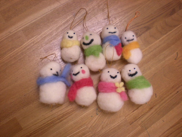 今日は、羊毛フェルトの雪だるまをママ達と作りました。ニードル針で、羊毛をチクチク刺していくだけで、フェルトになっていくんです。とても簡単な手芸なんですよ。 40分くらいで雪だるま完成!!たくさん並べてみると、いろんな顔ができてかわいいです「育児の息抜きになった。」「手芸は不得意だけどこれは楽しい。」などの声が聞かれました。 育児の合間にちょこっとできる、そんなアイデアまたママスタディーでご紹介していきたいとおもいます。