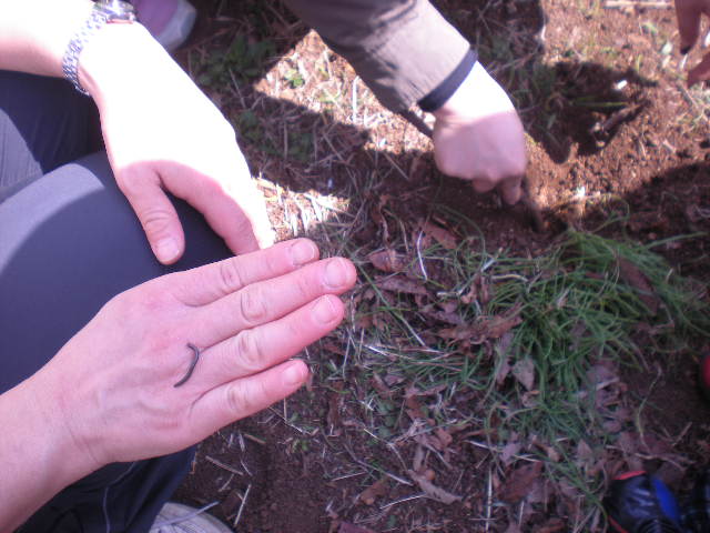 「子どものころよくほったんですよ~。」「葉っぱのところ刻んでたっべるよ。」「根っこの丸いきゅうこんのようなところ食べた―。」っと言いながらママたちが掘ってくれました。「のびる」です。春の香りがします。 ついでに、なにやら虫も出てきました。なんだろう。子供のころ「げじげじ」と呼んでいた虫かな?(手の上です) 冬を越したのかな???大きなバッタがいました。 男の子たちに大人気でしたよ。