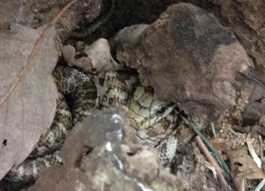 こんにちは、おそくなりましたが、6月7日の のはら で出会った小さなへびさんの写真をアップしますね。(枯葉に隠れてます。わかるかな?)写真では大きく見えますが、小さな赤ちゃんへびさんです。インターネットで調べたら、青大将の赤ちゃんに模様が似ていました。(詳しくないので断定できません、ごめんなさい)