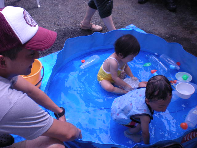 朝は、涼しかったんですが、だんだんお日様も出てきて、プール日和になりました。 泣いてしまって抱っこのお子さん、前回は入れなかったけど今回は遊べたお子さん、 はしゃいでお友達にも水をかけてあげたお子さんと、さまざまでした。 小さいお子さんは、それぞれのペースで場所や遊びになれていくんですね。 男の子のママと「おれ流なんだねー」っと、おしゃべりしました。 おじいちゃん、おばあちゃんたちにゼロ歳の赤ちゃんのかわいあんよが大人気でした。「さわらせて」「だっこさせて」とあっちこっちでこえが聞こえました。