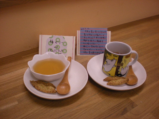 遅ればせながら7月のカフェの写真を。 つかれた体にしみる「梅ゼリー」でした。 ちょっと添えてあるのは「ずんだクッキー」。 形も枝豆ですね。どんな、お味でしたか???? 暑さ疲れも吹っ飛びそうですね。 みなさん、げんきに夏を乗り切りましょう。