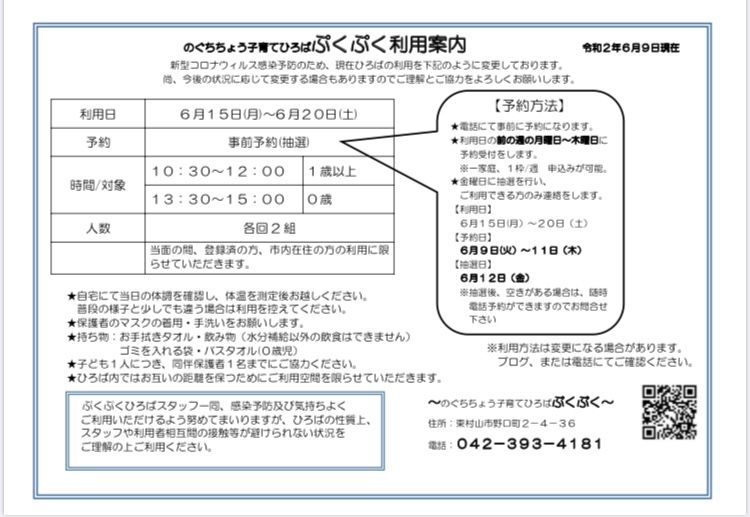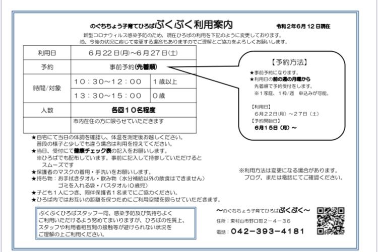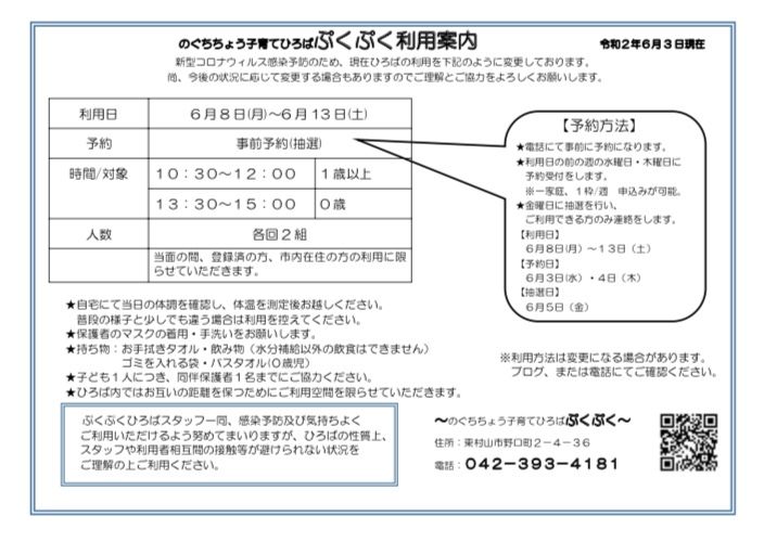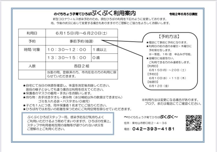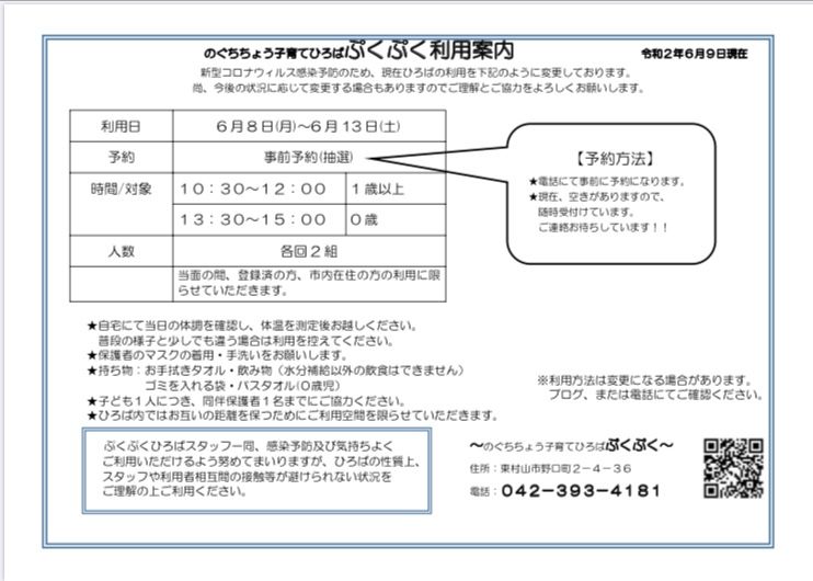 こんにちは🍀 6月8日(月)より予約制ではありますが、ぷくぷくが再開することになりました。 予約は一旦締め切りましたが、まだ、空きがありますので、お電話にてお問い合わせください。 電話:042ー393ー4181 また、当日も空きがある場合もありますので、お電話でご確認、ご予約の上お越し下さい。 下記の「利用案内」をお読みの上、ご予約をお願いいたします。