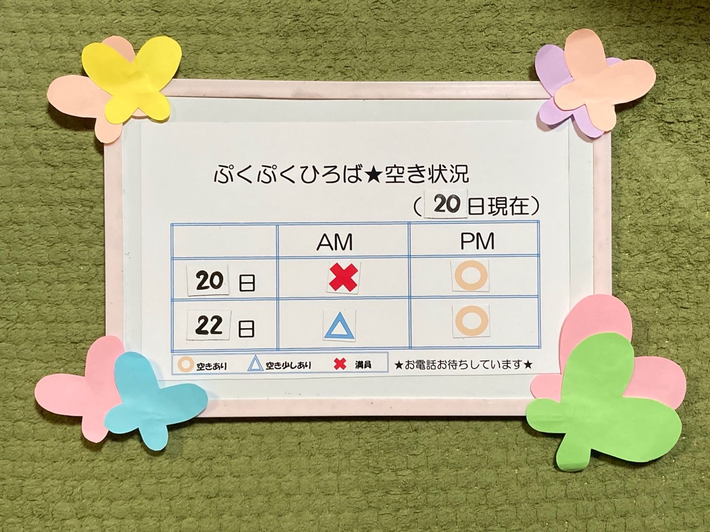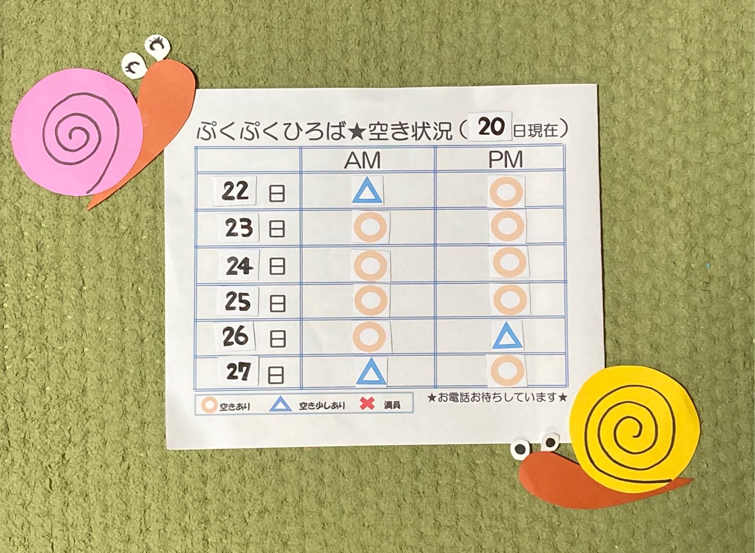 本日、午前、午後の利用に空きがあります! 午前(10:30~12:00) 午後(13:30~15:00) に現在空きがあります。 是非、ご利用ください。 利用希望の方は下記の利用案内を読んで ぷくぷくにお電話ください。 電話:042-393-4181 ~お待ちしていま〜す~ 明日のご予約にも空きがありますので合わせてお問合せお待ちしています! ひろばの窓から見える景色が変わりました! ご利用の際に お散歩ついでに覗いてみてくださいね。