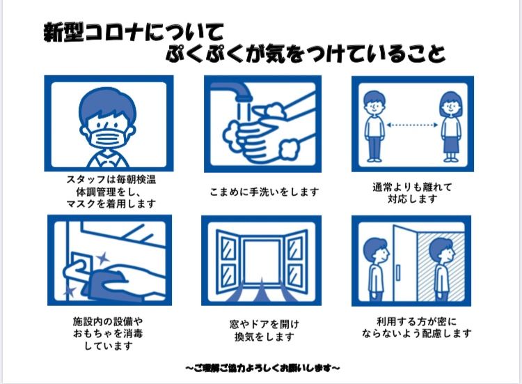 新型コロナウィルス感染予防にために 現在、ひろばの利用を変更しています。 事前予約、保護者のマスクの着用、手洗いのご協力など ほんとにありがとうございます。 みなさんに少しでも安心して利用していただけるように ひろばスタッフは下記のことに気をつけています。 ★施設内の整備やおもちゃを消毒しています ★窓やドアを開け換気をします ★利用する方が密にならないように配慮します ★スタッフは毎朝の検温、体調管理をし、マスクの着用をします ★こまめに手洗いします ★通常より離れての対応をします