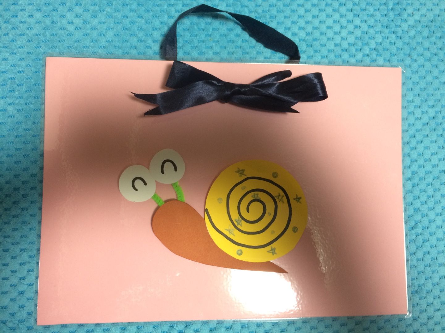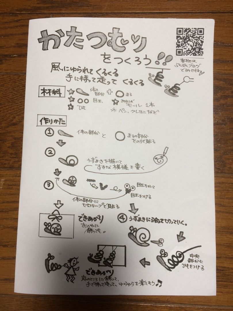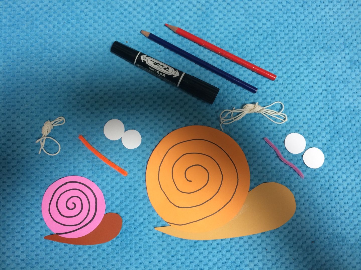 うずまきの線に沿って切って、紐をつけると、くるくる回るかたつむりのできあがり。