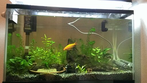 今日は水槽の蛍光灯を交換しましたよ~。 ホームセンターに行った際にホタルックに替えたかったことふと思い出し、とりあえず買ってきました! 写真に撮ってわかるかなぁと心配しましたが意外なほどハッキリ差が出ましたのでご報告を では↓こちらが交換前 GEXのマリーナ600セットに付属していたCL601付属のパナソニック昼光色フルホワイト使用です。 調べてみると色温度は5000K。肉眼だともう少し黄色っぽく見えます。 続いて↓が交換後 NECのホタルックのフレッシュ色です。色温度は8000Kです。 色温度が上がるとクリアにスッキリした印象になりますね アクア用で売られている蛍光灯は無駄に高いですよねえ そこで大した金額でもないですしホタルックへの交換は自信を持ってオススメできます! その際は色温度にご注意を! 【あす楽対応】NEC FL20SSEDF/18-SHG ※実は水槽全景は今回が初めてブログへのアップだったりします レイアウトが絶望的とかコードくらい整理しろとかのお叱りはご勘弁を ではまた!
