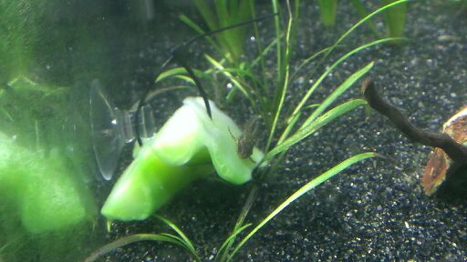 我が家の30cmキューブの面々はプレコタブが大好きです。 写ってはいませんがアカヒレもタブが沈んでる最中につついてます。 キョーリン ひかりクレスト プレコ 78g 丸々入れると大きすぎるので1/6くらいに割ったものを2つか3つ入れています。 入れるとコリたちが「ハッ!」とするのがわかります。テンションが急上昇 うちのコリはもともと活発なパレアトゥス、モフモフというよりもズドドドとタブを押しながら底を泳ぎ回っています。 GHDたちも負けじとつつきます。 ゴールデンハニーレッド・ドワーフグラミー(3匹) グラミーにプレコタブは予想外の組み合わせですが、一心不乱に突ついているのでうちの子たちの口には合ったんでしょう。 しっかり食べて独特な触角?より長い糞をぶら下げながら優雅に泳いでますね もし上層中層の泳ぎの達者な魚を混泳させていて GHDが食べる前に餌が取られちゃうとお困りの方がいれば一度プレコタブ試してみてはいかがでしょうか。 まあGHDも結構突っ込んでいくのでお困りの方なんていないかな 実はオトシンにはまだ大好物とまではいきませんね。 水草やガラスをカジカジしてる最中にたまたまタブの近くを通り掛かるとモフりにやってきます。 まあ一回モフり始めるとちょっとやそっとではどきませんが(笑) オトシンネグロ(3匹) そんな感じでみな元気にしています。 知人の水槽ではコリドラスパンダの稚魚が次々孵化してて楽しそうです。うちの子たちもがんばってねー! ではまた!
