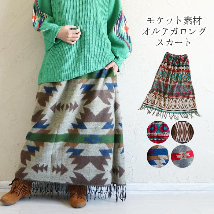ロング丈 体型カバー ウエストゴム 幾何学 フリンジ もこもこ ネイティブ あたたかい…