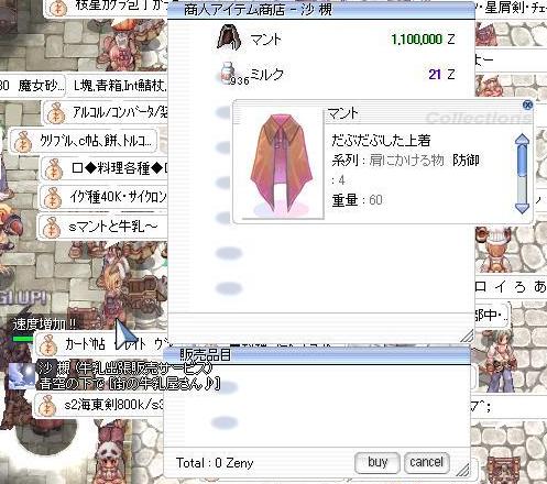 最近BOT駆除などをがんばろうと思っているjosyuwaです。こんばんは。ということで(?)アンチBOT関連のページを周っていたりするわけですが~。Picoろださんを見に行ったときなんですが・・・詐欺露店として自分がUPされてましたorz言い訳になりますが、これ、sなしマントをまったく疑いもせずにsマントだと思って露店に並べてます(ノ∀`)知り合いとカタコン行ったときに肩にかけるものをDROPしたので鑑定したんです。そしたらマントだったんで、確認もせずにsだと思い込んでいたわけですorzこれ、3~5日くらい気づかずに値段を下げながらなぜ売れないんだと露店に並べてました・・・あるとき、親切な方が「そのマントsついてませんよ~」ってwisくださいまして。そこではじめて気がつきましたorz幸いなことに誰も間違えて買わなかったので問題はありませんでしたが^^;ところで、Picoろださんなど(?)にはその後詐欺などしていなくても特にUPなどはされないんですね・・・・。勘違いした自分が悪いのはわかってるんですが・・・。いろんな人が自分の露店を未だに詐欺露店だと思っている可能性もあるかとおもうと・・・・かなり凹みますorzだからと言うわけではないですが、最近(sなし勘違いしてたころからですが)見やすく(人が少なく)人通りがそこそこあるところにお店開いてますwこんな感じでw最近は売るものがないので牛乳ばかり売ってますが~。不正者を取り上げるのは特に問題ないですが、不正をしていない状況が続いたら、そのことも取り上げて欲しいものです(´ω`)