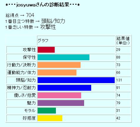 どうもjosyuwaです(´ω`)いまさらですがクマさんのところにあったバトンを拾ってきました(´ω`*)HNバトンでしたっけ?1.貴方のLNまたはHNは何ですか?HNってハンドルネームのことですよね?ね?一応josyuwaです~2.由来は何ですか?聖書に出てくるヨシュアっていう人が好きだからです(´ω`*)ヨシュアを英語読み(?)にするとjosyuwaになるようですw3.差し支えなければ本名もさすがに本名は言えませんよ(*ノノ4.本名の由来は?なんか字数とかなんとか・・・よく知りません(´ω`;)5.過去に使われたHNまたはLNは?基本的にjosyuwaしかないかな?たまに違う名前のときはシオン・ファクトですw6.過去につけられたあだ名は?Iris時代に最初につけてもらったあだ名は「ジョー」ですwROのキャラの名前は共通点がまったくないので、キャラごとに違う名前(あだ名)で呼ばれてましたwIrisのお知り合いの方からは基本的には「ジョー」もしくは「ジョーさん」でしたwForで最初いたGでは、ハンタが所属していたため、「雪さん」とか「雪村さん」今のGでは、プリが所属しているため「Stさん」とか「クリさん」って呼ばれてますw7.今まで可愛い!と思った名前はありますか?「綾乃」とか「雪乃」とか「○乃」っていう名前wほかにもいろいろありますが、だいたいこんな感じですw8.一番大切な人になんて呼ばれたいですか?やっぱり名前ですね~(´ω`*)ただ、大切な人がいないのであれですが(´ω`;)9.本名とHNどっちが好きですか?どっちも好きですよw若干josyuwaのほうが好きかも?w10.また生まれ変わってもその名前でいたいですか?特にそういう風には思わないですねぇ(´ω`)11.次に回す五人五人も知り合いがいませんorzということで、お好きにどうぞ~w