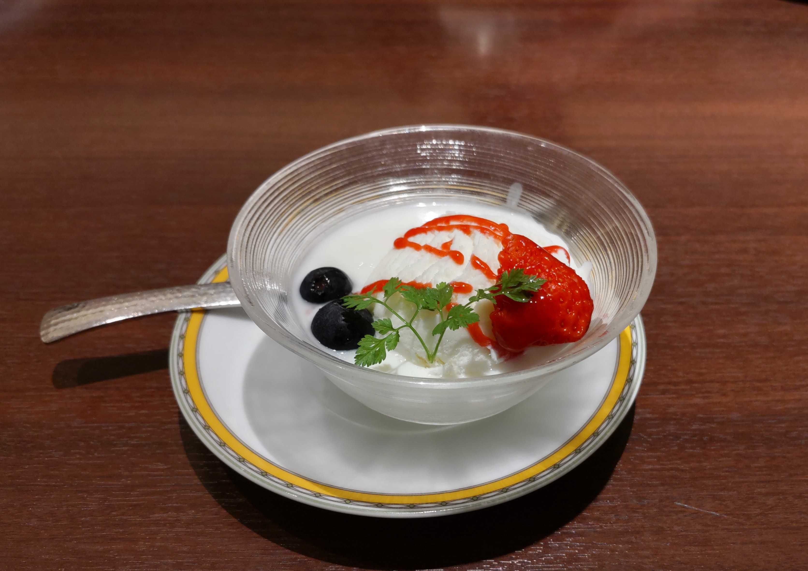 最後のデザートは ココナッツアイスとフルーツのいちご杏仁ミルク