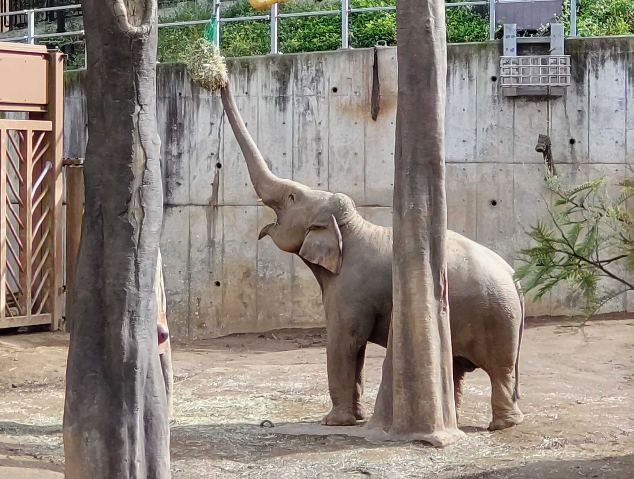 象は長い鼻で吊るされた餌を上手につかんで食べていました。