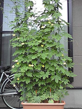 だいぶ目隠しになってきました。雄花は花盛りで、一日に10個くらいは咲きます。雌花も少しずつ咲きはじめ、今日も一個見つけました。 つぼみも見つけました。なんだかわくわくします。一個目の雌花は受粉に失敗したみたいで、ふくらむ気配がなかったのですが、二個目の雌花はみごと受粉成功で、日に日に大きくなっていきます。また追肥しなきゃいけませんかね。