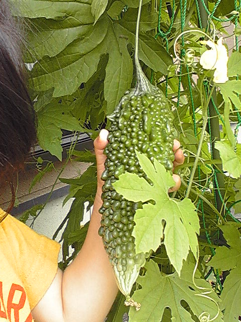 数日出かけている間に、すっかりゴーヤーが成長していました。子供の腕より太くなっています。本当はどのくらいまで大きくなるのか見てみるつもりでしたが、わたしが耐え切れず、収穫することにしました。はさみを子供に持たせ、チョキン!味は今夜のお楽しみです。