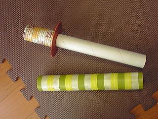 時代劇が好きだ。昔の王道も好きだし、3匹が行くなんかも好きだ。中学の時には竹刀が持ちたいばかりに剣道部に入部してしまうくらい好きだ残念なことに自分には剣の道のセンスは皆無だったが。そして劇団☆新感線が好きで、公演は観ていたが、今は子供が小さいのでDVDを観てストレスを発散させている。この前、新感線Rの五右衛門ロックを観ていたら、子供が古田新太さんの大見得をきっているシーンを見て「かっこいいねえ」と言い出した。まだ3歳にならない子供でもこのかっこよさが解るのねなんて喜んで、勢いあまって作ってみました。単純にラップの芯にマスキングテープを巻きつけただけです。鞘とつばもこだわってつけてみました。↑これとこれを使いました。テープなんで、作っている最中に子供の妨害がありましたが、こういう作業は楽し~い喜んで遊んでくれていますが、一度私の頭をポコンとやってきたので、教育的指導をしました。