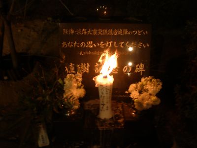 16日土曜日の夜、例年同様仕事帰りに「追悼ろうそく灯火イベント」に寄ることにしました。家内を誘うと「行く」とのこと、通勤リードに2人乗りして昆陽池公園に出かけました。今年は節目の15年目だからか、少し参加者が多い感じです。記帳と寄付をしてシートで囲った広場に入ると、たくさんのろうそくが灯っていました。手前では、夜9時だというのに、手作りろうそくに列をなしています。ろうそくの芯になる紐を液体になったロウのツボに突っ込みます。糸にロウが付着し、ツボから上げるとすぐに冷えて豆ろうそくになります。これを繰り返して少しずつ太くしてオリジナルろうそくを作ります。震災の翌年のイベントに子供たちと参加したとき、3人で何度も往復して作ったものです。この日も並んでいるのは子供たちが多かったようです。でもわが子と並んだ時は夕方だったけど、もう9時を過ぎてるのに・・・良い子は家に帰らないといけないのに・・・でもこの子達は、震災当時まだ生まれていなかった。単なるろうそく立てのイベントと思って毎年来てくれたらいいな。だんだん親から子に伝わり、百年後もお地蔵さんじゃなくてイベントとして残るかもしれない。家内と僕は、それをスルーして、箱から太めのろうそくを取り出し、広場に並べられたろうそくから火をもらい並べました。手を合わせている方、はしゃいでる子、ろうそくに書かれた文字を読んでる方・・・思い思いに揺らぐ火を見つめています。僕の横で見つめている家内の横顔が、ちょっと素敵に見えてしまいました。翌朝目を覚ますと5時半、「行ける」とガバっと起きだし速攻で着替え、再び昆陽池公園に向かいました。多くの方の人生を変えたあの時刻を皆さんと共に黙祷しました。昨日の広場の灯火は、きれいに流さの揃ったろうそくに変わっていました。多くの方が一斉にろうそくを入れ替えたようです。これも含めての黙祷だったようです。イベントコーディネーターさんの挨拶が終わり、撤収が始まりました。外の囲いなどから片付け、ろうそくは最後のようです。だんだん少なくなる灯火の周りの人・・・僕はしばらくそこにとどまり、じっとじっと灯火を眺めていました。また来年だな。