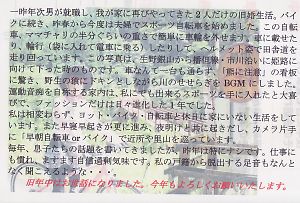 喪中欠礼のハガキ制作を終えました。喪中につき年賀状を失礼させていただく旨のハガキです。普通は、11月下旬から12月上旬、先様の年賀状準備前に送るのが礼儀ですが、母が亡くなったのが12月21日で23日まで喪主をやっていたので、とてもそちらに手が回りませんでした。21日にどうしようか考えて、今更出しても混乱させるだけだと思って年明けに出すことにしていました。そのことを家内に話すと、「あの年賀状、出したかった~」との返事でした。家内の年賀状も僕の仕事で、ずっと製作発送していました。僕の年賀状は、トーンを落とした全面写真をバックに、我が家の1年の出来事を面白おかしく書いたもので、読ませる年賀状です。友人からは「親ばか年賀状」と命名されています。あんな年賀状、他家からいただいたことはありません。家内用の年賀状文面制作を始め・・・といっても大抵1日で完成・・・母の亡くなる前日の夜、家内の店に置いておきました。母の死でてんやわんやしてる時、仕事の段取りで店に行ってそれを見た家内は、「いいのが出来たのに、出せなくなっちゃったね」と残念そうでした。今年いただいた年賀状で、住所等のチェックをして、親戚へ・家内の・僕のの順にハガキを制作して行きました。普通ハガキのオモテ面、宛名の下に、喪中欠礼のお詫びと母の最期の様子を少し書き、裏面は当初の年賀状とほぼ同じにしました。親戚関係と家内関係は昨日発送し、僕関係は今夜投函する予定です。親しい友人等には、メールで母のことを書きお詫びしましたが、「いつもの親ばか年賀状が届かないから、何かあったんじゃないかなと思ってた」との反応ばかりでした。変わった年賀状だから目立つので、何も連絡しなかったら「あいつは死んだ」と思われてしまいます。これで一段落です。