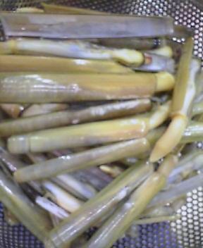 これ見たことありますか?昨日母が近くの海で採ってきました。こちら九州ではマテ貝っていいます。潮干狩りみたいに潮がひいた海岸の砂浜に1センチくらいの穴が開いています。そこにこの貝はいます。採り方は砂地をあさりみたいには掘ったりしません。この穴にお塩をひとつまみいれるとそのあなから潮水があふれてきます。するとこの貝がぴょ~んってでてきます。そのときをさっと捕まえます。掴みそこねると貝は砂浜の穴に戻ってしまいます。母や父曰く食べるより採るほうが楽しい♪ とのこと。私は今晩この貝で、最初さっとボイルして、その後バターでソテーしました。塩もかけず、そのままの味で旦那様のお酒の肴にGOOD!でした。あとは冷やしトマトのスライスまぐろ丼、お吸い物。でした。