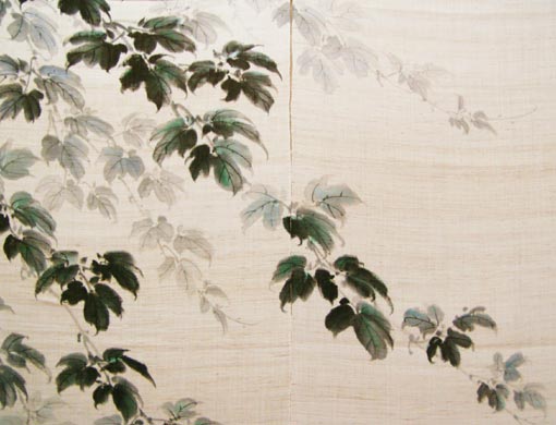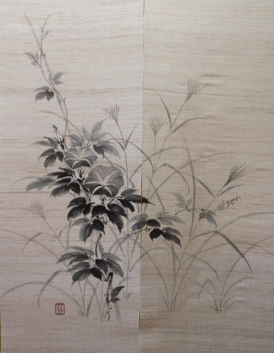 能登上布に蔦模様のノレンを描き終わったところに従姉妹の息子夫婦がやってきた。初盆のお参りに帰省したという。ワイワイ話をして帰った後、次に描く生地を並べたのだが・・・布目がわからない。描くとき布の表裏と生地の織り方向をそろえないとイケナイ。麻ノレンは特に生地自体に重さがあるから長期間吊り下げておくと生地のたるみが見えてくる。写真、生地の下の中央部分が両端より下がっている。これを間違えると裾がSを横にしたように波打って見苦しい。依頼主のほうは、余り気にしていないようなので、コチラがチェックする(^^;今日も暑い!冷房を掛けた仕事場に一日中篭る。冷房がないと仕事にならないが、足腰がガクガクしてくるし目がショボショボして生地の表裏を見抜けない(TT;)といって、パソコンに向かうとドライアイなのだった(--;