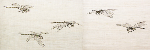 今日の暑さは、すごい!兵庫県豊岡市の最高気温38.6度、群馬県館林市で38.3度。東京・練馬区で37.6度、福岡県前原市37.6度、甲府市で37.3度、岐阜県白川町36.5度、・・・熱中症などの事故相次ぐ。我が家で34度程度。こういう日は家の中で仕事に限る。・・・納期切迫!!!(汗一見、印象だけは涼し気な麻ノレンにオニヤンマを描く。以前の日記に「次の機会にはもっと省略して描きたい」と書いたことがあるが、・・・まだ省略しきれない未熟者であった(--;この大きさの体型で軽やかに飛ぶことを表現するのは難しい。せめて気持ちの中で「もっと飛べ!」「空気をつかめ!」と叫んで描いてみた(笑・・・作者に似て重たいのが何匹か居るわ(--ゞ