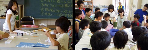 毎年、恒例になった『こどもエコロジーキャンプ』の生葉染め教室。今朝刈り取った藍の生葉をミキサーで粉々にした液で、絞りを施した木綿のハンカチを染めた。石川県内の小学生高学年の24人と手伝ってもらった大学生のスタッフ。子供たちは、穴水町にある農業体験のできる「四季の丘」(廃校になった小学校をリニューアルした自炊型宿泊交流施設)で、かぶとむし獲りやジャンボカボチャの提灯作り、きび団子づくりなどで2泊3日の農業体験をする。暑い一日、世話をする人は大変。学生は元気だが(^^私は進行のために、2時間ほど子供たちの周りを歩いただけで足が痛くなった・・・(^^;