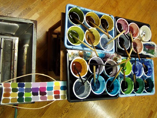 暑い!しかし、夏は暑いのが夏らしくて良い。ほどほどに季節らしいのがイイわ(笑こういう日は、1日中家にこもって仕事。というより盆前の追い込みで、もはやバテている(^^;が、このところ硬い話が続いたので今日は夏の色について。色っぽい話ではなく・・・染料の話(^^梅雨時から夏にかけては、色が長持ちしない。湿気が多いと腐ってカビも生える。薄い色には胡粉が入っているものも多く、更に腐りやすい。みょ~うな甘い香りがしてドロリとした感触になる(--;)もちろん防腐剤も入れているが、暑いので冷房を入れると染料の液自体の乾燥が早くなり色の濃度が変わる。毎朝、色の調整から始まるが、これがけっこう時間を費やすのだ。絹用の化学染料は水彩絵の具に似ている。しかし、使うときに混色することはめったになく、目的の色を必要な数だけ合わせるために色数が多くなる。これは着物の場合、特に合い口(身頃など縫い合わせ)の模様を同じ色にしないとイケナイ為でもある。ちょっと使う色が多すぎて混乱。ガスコンロの上は実際の生地に使った色を見本として乾燥させたもの。こうして残しておくと、万一腐っても、この見本と同じような色を再び合わせて作ることが出来る。・・・まだまだ色数は増える予定(笑暑い一日。めまいしそうな程の夏の色(^^;