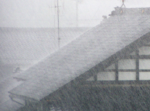 朝から雷が鳴り停電・・・ローソクの明かりの中で朝食を摂ったが、妙な感じだった(^^;停電で仕事にならず、ただ雨を見ていた。降りしきる雨が滝のように流れ落ちる。音を立てて屋根を打ちつける。跳ね上がった雨滴が屋根の向こう側、白いラインになってボカシを描いていた。「雨の描く白いボカシライン」私の5年物のデジカメでも、かろうじて撮れた(^^驟雨(しゅうう)は夕立のことかな?日中の雨は、そう呼ばないのだろうか?家の前の坂道が雨で削られて土砂が落ちてしまい、午後には補修作業に出た。・・・ほんとに、文字通り土砂降りだった(--;