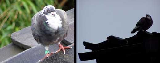 一昨日のこと。出先から帰ってくるとガレージの中に何か生き物が居る。ガレージには、よく野良猫が入っているし、イタチ、タヌキ、テンなども出没する(^^しかし、車が入ろうとするのに動かない。何?仕様がないので降りて確認すると鳩。右足に緑色の脚環が装着してあるから、伝書鳩?レース鳩だろうか?近寄っていくと外に逃げ出したが、家の屋根に上がってそのまま動かない。レースの途中なのか?迷ったのか?子供の頃には近所でも鳩を飼っている人がいたが、最近は見かけなくなった。私もヒワやジュウシマツなどを飼ったが、スケッチはしても余り世話をしなかった(^^ゞ染色の工房で文鳥のスケッチをしていたとき、鳥が動かないので籠を叩いて色々な動きを描いていたら、(例のサウナの)上司に「鳥の恐怖を描いているのか?」と言われたことがあった(--;今でも着物の仕事上、鳥の絵を描くことも多いがハトは描いたことがないなぁ~と思いながら写真を撮った。屋根上のハトは疲れ果てていたのだろうか?ほとんど動くことはなかった。夜半、雨が降り朝には姿が見えなかったが、無事帰ったものか?鳩も迷子になり、見かけがハトのタカもリタイヤした・・・って、世の中の動きが激しいので鳩の話題を書いても政治を連想してしまいそうだ(^^;