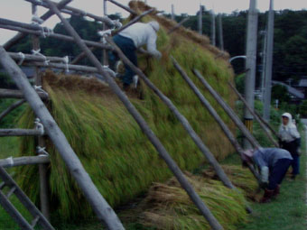 夕方、国道沿いに「ハザ」干しする農家の姿があった。せっかくのシャッターチャンスだったが曇り日の6時半ということと、デジカメの調子も悪く落ち着いて撮れなかった。おそらく今でもハザ干しの米にこだわっている農家だろう。写真だけを見ると秋の風物詩の一コマになるかもしれない。そして、それを写す私がいた。我が家も子供のころは日が暮れるまで稲刈りをして、家の明かりを外に引きハザに稲を掛けていた。この季節、作業が遅くなり晩御飯が9時ころというのも珍しくなかった。あまり役に立つほど手伝った記憶もないが、風物詩というより生きるために必死で農作業をした時代があった。そして、家の田は親戚の農家に依頼して、この大変な作業を放棄してしまった私。写真を落ち着いて撮れなかったのは、私の中にある何かしらの後ろめたさも原因だったかもしれない(^^;