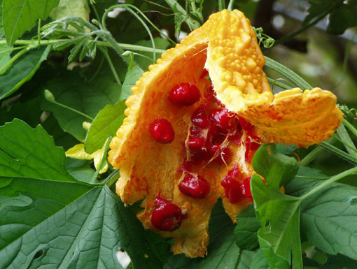 我が家のゴーヤーの様子を見に行った。最近雨が多くなったので葉は青々としている。大地の水分を吸って実の育つこと!そして、夏のエネルギーのいっぱい詰まった実らしく、皮も種の色も鮮烈だ!さすがゴーヤーらしい熟し方だった(笑)後ろの方に見える花は開いたもので5cmほど。普通に黄色いウリ科の花だ。まだ小さな実もたくさん付いている。ゴーヤーの前で写真を撮ること数分間・・・腕も足も腹も顔も背中も蚊に刺されること数十箇所!逃げ帰って来た(^^;3分後、私の腕は見事にゴーヤーのようなブツブツ姿になった・・・(痒痒)