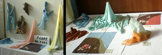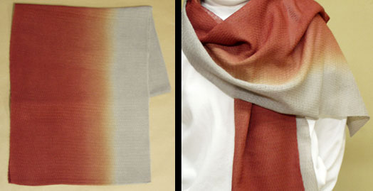 冷たい雨の降る寒い一日。町の老人生きがいセンターで草木染め教室があり、妻が出かけていった。今日の課題は『絹ストールのボカシ染め』。いつも無地染めばかりだったので生徒さんが飽きてきそうだ。ということでグレーとレンガ色の2色のボカシをあしらった。絹ストールのボカシ染め ゴバイシ+アカネ染め草木染めは一色を染めるのに、染め20分+媒染20分+染め20分(+媒染20分)を丁寧に行うと約2時間必要になる。しかし、それでは単発の教室では無地染めしかできない。そこで絞りなどを入れるが、それも手間のかかる作業を行うと2時間では終わらない。結局、いつも簡単な方法しか出来ない。町の老人生きがいセンターは60歳以上の人が対象だ。誰でも自由に参加できる教室なので難しい方法や前もって行う作業方法は教えられない。しかし、生徒さんは「もっと違う染めを希望」する。そして、なおかつ、参加者だれもが失敗しないようにすることが必要で・・・失敗するのは教え方が悪いのだ(^^;・・・この条件が難しい。そこで、簡略な方法を工夫する。写真は昨日妻が練習したもの(笑本来はゴバイシの染めをしっかり行ったうえでアカネを染める。実はこの教室、最初の一年ほどは私が教えていたのだが、条件が厳しいのでギブアップしたのだった(笑