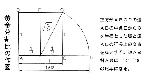 パソコンの画面のサイズを見ると横:縦=1024:768というのがある。この比率は1.33:11280:1024は、1.15:1、ワイドの1280:800は約1.6:1で、1680:1050も1920:1200も約1.6の比率になる。このままの縦横の比率でどのパソコンでも見られるような仕組みや、電波に乗せて送るほうも受けるほうも同じになるような仕組みにしてくれれば良いのだが・・・そうなっていないのは、技術的に難しいのだろうか?(^^;さて、この縦:横=1:1.6の比率は黄金分割と呼ばれた比率。ブログ仲間のクりムソンさんの日記で思い出した(^^) 仕事上では、図案を描くときに以下の簡単な製図方法を覚えた。名刺、タバコの箱などのサイズの比率に使われ、テレビのワイド画面やパソコンの横長ディスプレイで見かけるようになった。古代ギリシャ時代からの美しい比率ということだが、どうも横長に過ぎるようにに思えてならない。私自身は√2の方が使いやすい(笑で、√2の軌跡について(^^コピー紙などの縦:横=√2(=1.414):1のほうが、日常の感覚として身についてしまったようだ。この比率は、正方形の対角線の長さで、縦1、横1.414の長方形は、白銀長方形、ルート矩形、またはルート長方形などとも呼ばれるらしい。白銀比(はくぎんひ)は、1+√2:1=(約)2,414:1。用紙のA0サイズが1189:841=1.414:1.0であるが、この面積は縦横を掛けると約999949で、約1平方メートル。B0サイズは1456:1030、これはA版の面積の1.5倍、約1.5平方メートルになる。A版もB版も半分に折るとサイズがA1,A2・・・A4,A5・・・と下がっていくのは周知のとおりだが、A版もB版もサイズが小さくなっても縦横の比率はすべて1:1.414のままになる。これが√2のがすごいところだ(^^私の感覚では、この√2の比率のほうが黄金分割よりすごい比率だと思えてしまう(笑余談だが大工さんの使う曲尺(かねじゃく)の裏の寸法は√2なのだった(^^