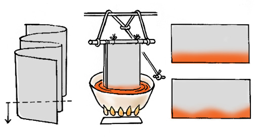 浸し染めでボカシを染めるには(18日の日記)、ボカシをする部分だけ染め液に浸せばよい・・・のだが(^^;)20分間加熱するのは熱いかも?布を固定する方法があればよい。(下の図中央)上から吊り下げるためには紐でも良いし棒でも良い。固定するのが面倒な人は手で持って20分間頑張れば良いのだが・・・(^^前もって一色に染めた布を『屏風だたみ』にして、竹の箸などで布の上部を巻きつけて液の中に落ちないようにする。染める前に布全体を濡らしておくことが重要。左図、点線の部分より下。布を液の中に水平に浸すと真横にボカシが出来るし、斜めに浸すと段駄羅模様になる。後の媒染も布全体を浸してしまう方が染としては確実なものになる。これで出来るはず(^^出来ない場合は能登まで来るしかないかも(^^
