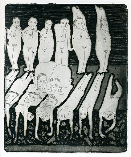 地区の文化祭に出す絵の額を探していたら、不思議な絵を発見した。この絵は何だろう?ちょっと想像してみる?答えは下の部分を反転。想像した後で見るほうが良いかも?・・・そういえば、こういう時もあったんだと笑った(^^版画に興味を持った時期があってエッチングをかじったが、その中の一枚。京都在住時。たぶん、27歳くらいのとき。・・・いったい何を考えていたものか?自分でも、ちょっと面白い(笑この時期、仕事を終えるとアパートに帰り毎晩のように花のスケッチをしていたが、今思えば、逆に仕事とは関係のない絵も描きたかったのかもしれない。しかし、落書きならともかく、わざわざ手間のかかる銅版画にしたところが不思議に思える(^^;さすがに文化祭には出せないが、老後にでも、もう一度こういう絵に挑戦しようかな(^m^)
