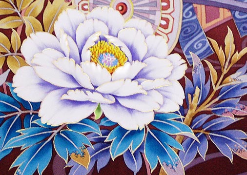 黄金比と白銀比の話の次で、今日の日記は『黄金の線』について・・・タイトルが大げさだ(笑着物の模様で『金仕上げ』『金彩』というのがある。花のアウトラインなどを金の細い線で仕上げたり、模様に金粉を散りばめたり金箔を貼ることもある。私はめったに金を使わないが、留袖や振袖など晴れの席で着る着物の場合に仕上げとして使うことがある。牡丹の花に『金仕上げ』私のデジカメで撮っても金の状態がキレイに写ってくれない。よって、画像ソフトで少し加工を加えた。模様はローケツ染めなので一般的な友禅模様とは違って、本来の仕上がりの状態時には、縁取りに糸目(細い)線がない。そこで金の線を筆で描き加える。花びらや葉など全体に均一な状態で線を置くのは私の好みでない。全体に入れるとプリントのような感じに思えるので、線に強弱を付けたり、描き消しや全く入れない部分を作る。息を止めて、ビシッ!と線を入れる!がしかし、最近、一気に描けない・・・息切れがする(--;)・・・いや、そうじゃなくて、私の目は、このアウトラインがボケて見えるようになってしまった。老眼ではない様で、どうやら乱視が出てきているような気がする。30分ほど仕事をすると視界がボケてくるのだ。(--;黄金の線をビシッ!と決める。と言いたいが、目がお粗末な状態なので決められない。・・・なんとも情けないわ~。年をとるというのは辛いもんじゃな~・・・手も震えてくるし、腰も痛いし、腕が悪いんじゃない、この目が悪いんじゃ・・ブチブチ、ブチブチ。・・・んなこと言ってないで眼科へ行くしかないな~(^^;