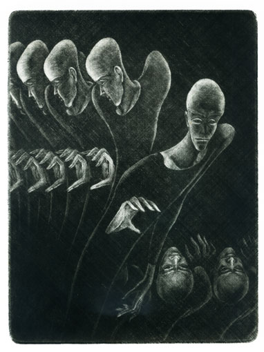 妙な絵シリーズ?・・・違うわ(笑なんとも説明しがたい絵だけど、銅版画シリーズ2枚目。・・・もう無い(^^;エッチングは銅版にニードル(針の尖った先)で傷をつけることによって、傷の凹んだ部分に色がつき絵になる。傷の黒い部分は丁寧な仕事をしないと均一にならない。傷の中にある絵の具を圧力をかけて紙に印刷する。明るい部分は傷がついていなくスベスベな銅版の状態で色が付かないから、刷り上げたときに紙の生地色になる。・・・この程度しか説明できない(笑版画も面白いものだと思う。最近CGのプリントの説明に『電子版画みたいなもの』と言ってみたが、版画は手仕事の量がずいぶん多いし、刷り上げるときの緊張感も違うから、やはりCGを電子版画というには無理があると自分で笑ってしまった(^^ゞ