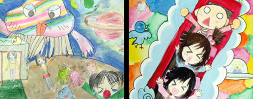 25日の地区文化芸能発表会の作品が集まってきた。搬入日まで我が家で仮りの預かり中。子供たちに未来の絵を描いてもらうと楽しい絵がいっぱいだ。いいよな~未来があるのは(^^;しかし、何とかこのアニメ風マンガ風描き方を絵画教室らしくせねば(^^いや、別にマンガ風が悪いわけではない・・・マンガ家さんに叱られそうだが(^^;今はこんな困った顔が流行っているのかな?・・・皆同じ困り顔では困るのだ(笑それぞれの観察眼を養ってもらいたいのだが。子供たちの未来予想図。宇宙人に会ったりロケットのようなものに乗ったり。将来は夢がいっぱいで良いわ!が、しかし、我が家の息子は将来なりたいものが無いようだ。目的がないとイケナイ!と親としては言う。・・・だが、その実、私も将来なりたいものが無かった子供だった(^^;けど、それは言わないことにしておこう。では、私の未来図は?オヤジの頭の中の概念を壊すような未来予想図は?・・・?・・・う~ん。たぶん私の場合は目が見えなくなり、痴呆症、腰痛もちの寝たきり。という定石パターン?・・・あぁ、たまには墓掃除もしないとイケナイな(--;・・・?・・・他?無いな~。・・・私のイメージも概念に固まってるわ(笑
