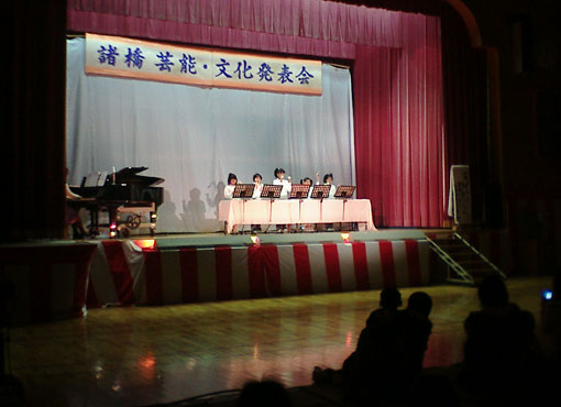 地区の芸能文化発表会が終わった。昨日の日記だ(笑昨日の入場者数は420余名。この地区の世帯数は実質500戸、人口は1200~1300人程度。単純に計算すると3人に1人が会場に来ていることになる。メインは体育館で行われる子供会や婦人会、各団体の演技や踊りだが、各集落の青年団や住民が裏方として音響や進行の係りで参加している。写真は子供たちのハンドベル演奏。舞台では25の演目があった。プログラムや展示が終わって、役員や係の責任者が先ず聞きあうのが事故や進行のトラブルがなかったか?ということ。転んでタンコブを作った人が一人居たらしいが、どうやら事なきを得たらしい。「展示作品で高価なものを出品したいと言って来たが、どうするか?」と公民館側から聞かれたのだが、値段の高低に関わらず子供から老人まで誰の作品であっても損傷させることなく、同じように大切に扱うのが展示するほうの役目。 が、しかし、右は手作りの作品で、音のなる竹鉄砲は触っても良い品。昨年は子供たちの使用によって壊された(^^;)そして、今回は乱暴に扱われても壊れないように改良してきたと作者が言った(笑展示するほうも、作り手も、こうした機会によって鍛えられることもある(^^2階には一般の作品とともに保育所と小学生全員の作品が学校との協力で展示された。子供たちの出入りも多く、生け花の台の下に幼児が2人もぐりこんでビックリ!コチラも係員が駆けつけて子供も花器も無事だった(^^片付けの後、会議室で打ち上げを兼ねた反省会が行われ、係員の感想が述べられ来年の改善策になる。この催しがトラブルなく18回も続けてこれたのは、こうした反省会を含めた会議や進行資料の多さだと思う。運営する公民館側の話では、事前の運営会議やプログラム会議、責任者会議などに係員の9割以上の人が出席するという。反省会。私の周囲に座った顔ぶれは初回から裏方をしているメンバー同士で1回目のときは30代、今は50代半ばになった者ばかり。会議で来年も続けて行うことが決められたが、「俺たち、幾つになるまで係りせんならんのやろ?」と顔を見合わせて笑った(^^2次会のスナックで少し飲んで帰って来てからパソコンを立ち上げたが、頭も身体も回転しない(--;)珍しく日付が変わらないうちに寝てしまった。今日も体の節々がオイル切れの感じだ。う~、疲れが3日後に出る高齢者のグチ日記が続く(^^ゞ