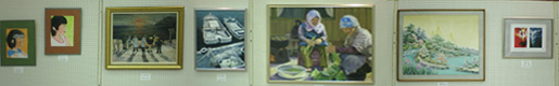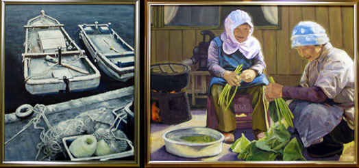 文化祭、絵画教室の生徒作品。左はF20号「雪の朝」 Kさん作。私の撮った船の写真を気に入ってくれたので使ってもらった。右はF50号「母の野やすみ」 Mさん作。田植えが終わって一段落したときの休息日を「野やすみ」と呼ぶ。ともにアクリル絵の具で描いた作品。これまではF10号程度が最大だったので一度大きな作品を描いて欲しかったのだ。月に一度の趣味の教室でアマチュアの人にF50号を描かせる方も無謀だが、生徒さんも本当に完成するのか不安だったようだ。実は私も心配だった(笑お2人とも約半年がかり。家でも頑張って描いたようでけっこう大変だったらしい。額に入れてみると、ちょっとした感動があった♪だが、次は小さな作品を描くのだそうな・・・(^^ゞ今夜はOさん家の御通夜。しばらく弔事が途絶えていたが寒くなってきたので、また増えるような気がする(^^;