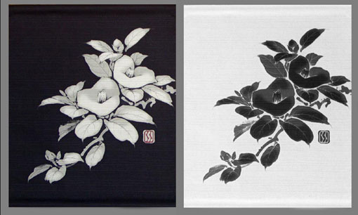 シロとクロの逆転は、犯罪の捜査だとマズイだろうな・・・(^^;が、絵の世界では『シロとクロ』を逆転させると、ちょっと楽しいことが起きる。昨日の椿のローケツ染めミニタペストリーの『シロとクロの逆転』。 PCでモノトーン調整。色の階調が逆転し墨画の濃淡のようになる。頭の中で想像するより、ネガとポジの関係は明快だ(^^上の2枚はローを落とした後で墨や顔料で葉脈を描いているが、下のムクゲは、ローで葉脈や花の線を入れている。ムクゲの右の図の線は墨の濃い色で描いているように見える(^^墨画の濃淡のリズムを把握すると、ローケツの濃淡の階調も把握できる・・・はず?但し、技術を把握するのは別。私も、こういう技法を長期間行わないでいると明らかに腕が落ちるのを自覚。描く前には、ものすご~く、ビビル!(笑曲芸のような一発勝負なので事前に練習するが、それでも思うようにはならないのが常だ(^^;