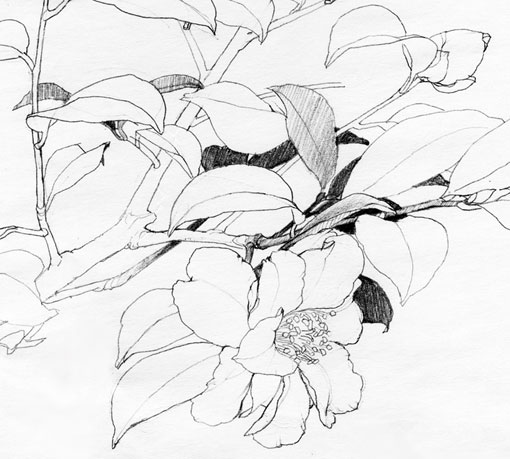 庭の白い山茶花が、毎日、見事に美しく咲く。仕事場に2枝持ってきて楽しんでいたら、2日目で見事に散った(^^;白い紙を背景にして描いたが、まだ未完のうちに散ってしまった。CG Photoshop この先どうしたものか?・・・しかし、白い花を白い紙を背景にして描くこと自体が疑問だ(笑
