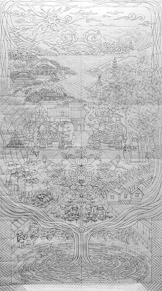 絵更紗の画面の中には時間を描くことができる。現実と非現実の姿も物語として組み込める。過去、現在、未来が混在し、空間も次元も違うものを一枚の布の上で描こうという、早い話が、何でもありの画面でもある(^^その一部。門前、総持寺宝堂の傾いた扉。今もそのままの姿で変わっていない。壊れた家屋や廃材。あえて地震のおきた時間で止まったままの時計を描く。恐怖や崩壊の姿を描き留めるが、子供たちには未来がほしい。夢や希望だけを語ることはできないが、怖いことや苦しいことだけでもないだろう。・・・しかし、まだ、たまに家が壊れるイメージに襲われることがある。家を失う怖さが植えつけられたようで、地震からこっち、寝るときや出かけるときに火の元の確認を2度行うのが習慣になった(^^;