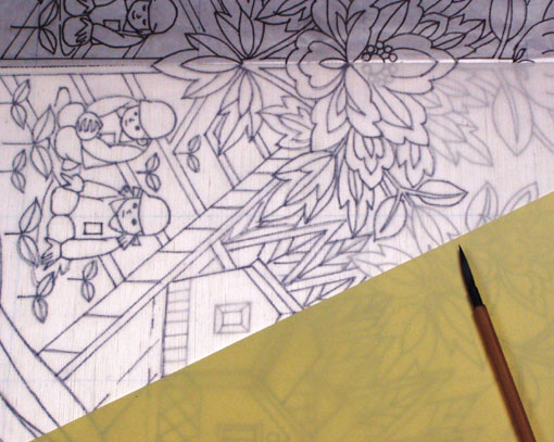下絵描き。水で消える青花液で生地に下絵を描く。ガラステーブルに図案を置いてその上に生地を置き、下からライトを当てて描く。写真の手前、黄色いのは当て紙。夏場などは手の汗が付かないように必須。青花を描いたところとは線が2重になって濃い部分。今回の生地は、紬なので表面がケバ(細かい繊維)立っている。筆が生地に負けることもよくあること(生地が硬かったり柔らかすぎて描けないの)で、ケバに負けて筆が先に進まないし、線がきれいに描けない。強く描こうとして筆のハラ(中央部分)を押し付けてもきれいにならない。青花液を十分含ませた筆先をそろえて、ゆっくり描く。筆の質が悪いと更に生地に負ける。線をキレイに描く感覚を分かりやすく言葉にすると「筆先で生地を切っていく」筆の切っ先を刃物の先のようにして、生地目に、ほぼ垂直に当てて描いていく。ん~~、言葉にすると、なんて大げさなんだろう(笑実際の作業中は、そんなことは何~も全く考えていない。下絵の場合は、息を止めてとか、気合を入れてとかは全くなく、むしろ淡々と。・・・眠くならないような程度で描く(^^ゞ