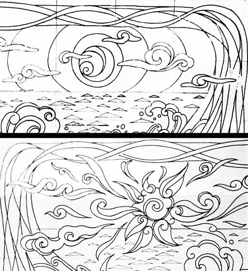 自分の描いた形を楽しんで彩色できる仕事というのには、めったにめぐり合えない。月の明かりと陽の光の中こういうフォルムを描くのは楽しい♪微妙に直線ではなく、微妙に正しくない円形・・・揺れながら、ぎりぎり平行線が続いていく。ぽってりとした(?)フォルムが好きだな(^^って、年末、落ち着いていられるかどうか疑問だが。仕事の中に没頭できる時間はありがたく貴重だ。今だけは世俗の雑音は聞こえない。いや、今後も聞かないでおこうかな(^^ゞ